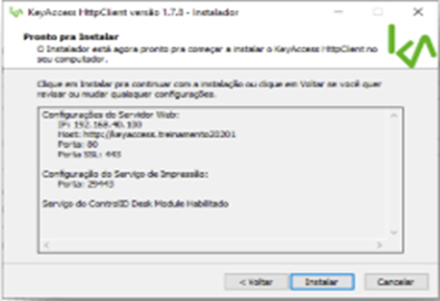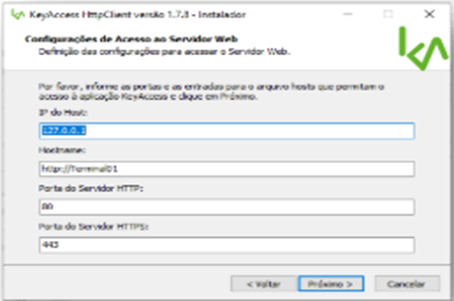 • As portas HTTP/HTTPS do servidor devem ser deixadas padrão (80/443), exceto se explicitado em contrário pela equipe técnica/SAC KeyAccess. Avance para a próxima tela se conferido que os parâmetros estão preenchidos de forma absolutamente correta