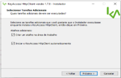 • Na tela seguinte, selecione as caixas caso queira, respectivamente, criar um atalho para o client na área de trabalho e/ou iniciar automaticamente o KeyAccess client assim que o Windows iniciar