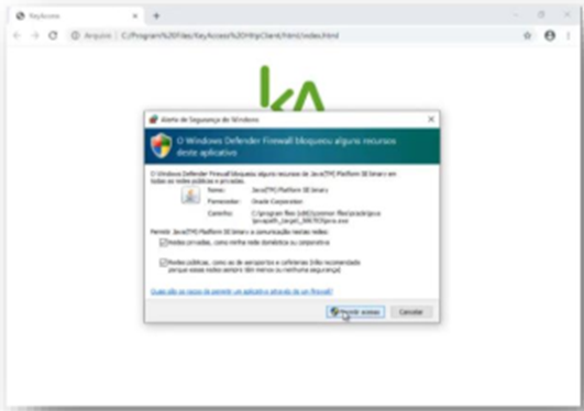 • Abra o Sistema KeyAccess® pelo atalho criado. Na primeira vez, pode aparecer este alerta de segurança do Windows sobre o JAVA. Proceda conforme indicado na figura a seguir:
