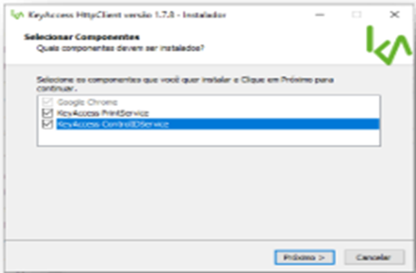 Tela de seleção de componentes a serem instalados. Instale o KeyAccess PrintService se necessitar imprimir códigos QR em impressoras térmicas a partir do client. Instale o KeyAccess ControlIDService se necessitar realizar cadastro em sistemas biométricos ControlID pelo cliente.